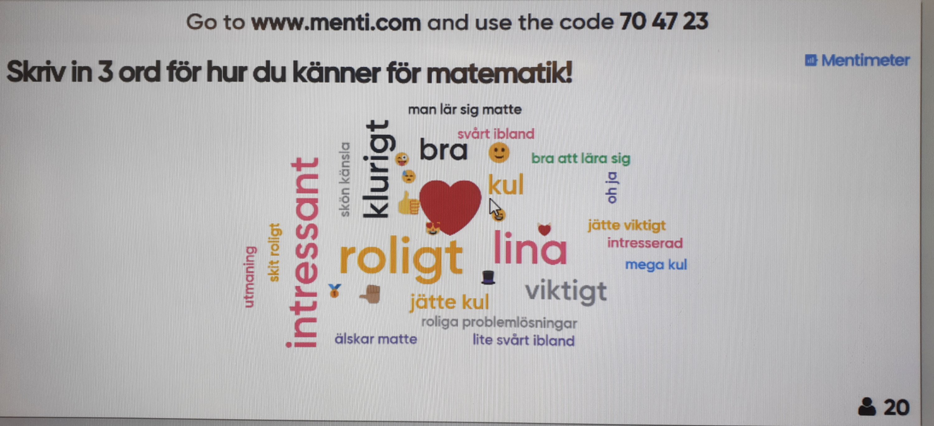 I förra veckan fick eleverna i lĂ€xa att göra en enkĂ€t som jag gjort, med pĂ„stĂ„enden kring mindset kopplat till matematik. Efter varje pĂ„stĂ„ende fick de vĂ€rdera sig sjĂ€lva med grönt, gult eller rött – samma fĂ€rger och betydelser som i vĂ„rt förstĂ„elseljus (vilket vi anvĂ€nder oss av pĂ„ de flesta lektioner). Efter att ha tagit del av alla 49 elevers enkĂ€ter hade vi idag en uppföljningslektion, dĂ„ eleverna fick svara pĂ„ en enda frĂ„ga pĂ„ sin lĂ€rplatta pĂ„ Mentimeter (menti.com); skriv in 3 ord för hur du kĂ€nner för matematik! Och för en medelĂ„lders mattefröken, som trots yrkets baksidor Ă€lskar att göra elever mattestarka, blev resultatet av denna lektion som en halsduk en blĂ„sig januaridag vid havet pĂ„ vĂ€stkusten – vĂ€rmande och mysig.